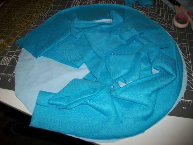 Una vez que ha hecho puede conectar los tira/triángulos a la base de la cama. Tomar una de las piezas circulares, de lado derecho hacia arriba, y coloque el lado derecho de la tira/triángulos hacia abajo en el círculo. Alinee los bordes de la tira con los bordes del círculo, asegurándose de que las costuras están frente a usted. Mantener los triángulos hacia el centro y asegúrese de que no quedar atrapados en el borde del círculo. Luego coloque el otro trozo de la derecha del círculo hacia abajo encima de ella. Alinee con el otro círculo y tira y pin juntos.