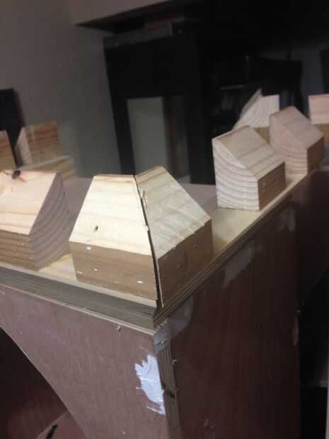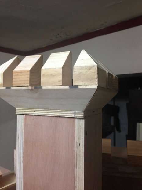 Del "hecho por mi de moldeo" fue pegado y atornillado a un pice de la madera contrachapada que va a ser sí mismo simplemente atornillado en la parte superior de las torres, en nombre de la "de-castleing"
