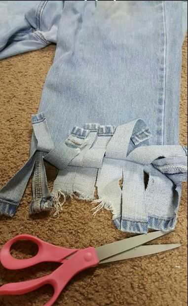 a continuación, tomarás tus tijeras y corte cada pierna desde la parte inferior cortar una hendidura hacia arriba aproximadamente 6 pulgadas ahora que 3/4 a 1 pulgada de espacio y tomar otra raja hasta 6 pulgadas y continuar hasta que tenga 5 ranuras de or6. Usted necesitará recortar la abertura de la costura de extremo y tire a la basura. Hacer esto en ambas piernas.