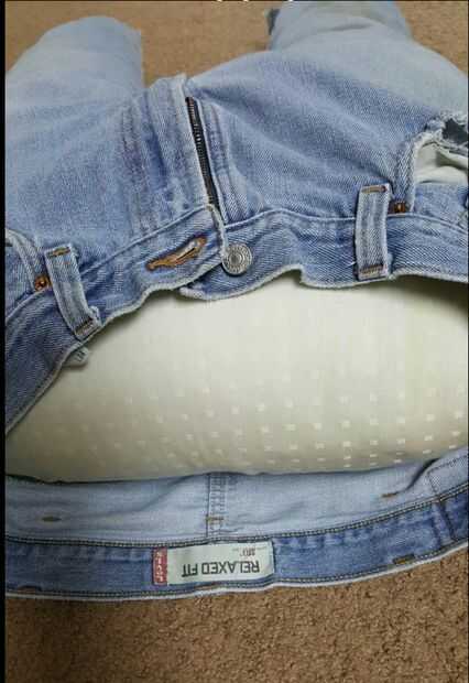 Ahora recuerdo que almohadas extra que no retire el relleno de? Va justo en la parte superior para crear la cintura de los pantalones vaqueros. Doblar por la mitad y sólo cosas en allí. Pack abajo porque no desea el relleno todo si el perro consigue a sus chompers en él.
