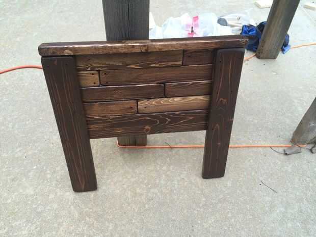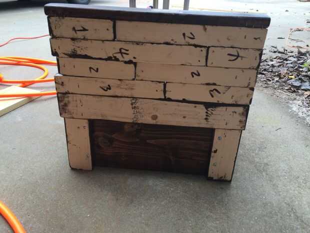 Organizar las filas en cualquier orden que desee. Como se puede ver, mina están fuera de orden por el número de fila. Fije todas las piezas cabecera seis a la dos 14" 1/2 piezas. Poner la pieza que no corte en la parte inferior de apoyo. Usé grapas de 3/4 y un poco de pegamento. Lo que usted use, asegúrese de que eso él no saldrá de la parte delantera de 14" piezas... que feo.