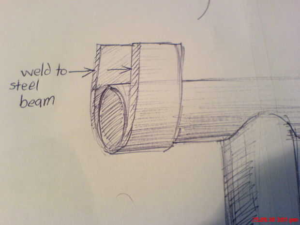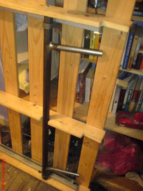 Luego hizo algunos patas plegables y los fijados a la estructura de acero con lazos hechos de barra doblado en formas de u, que soldado a las vigas. Permiten las patas giratorias... para que puede ser plegado/desplegado.
