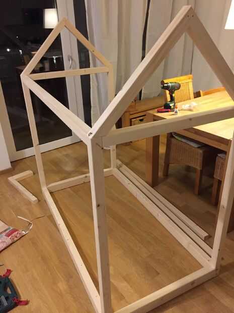 Las partes inferiores que son más gruesas Haz dos tornillos cada uno, la parte superior de la azotea también dos tornillos, y la parte inferior de la cubierta un tornillo y un taco (para evitar que la pieza giratoria). Ninguno de estos aditamentos use pegamento, para que yo puedo fácilmente desmontar la cama en el futuro.