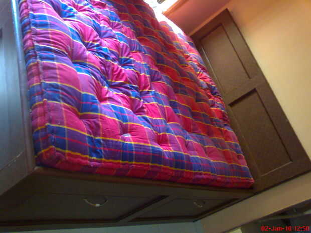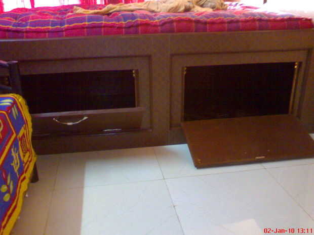 Mi cama plataforma se hace de arce sólido y madera contrachapada de la nuez, también construyó algunas debajo de la cama rodando cajones de almacenamiento para mantener los zapatos y otros artículos. La cama se acaba con el General finales Java manch
