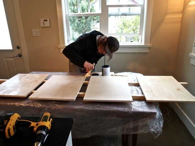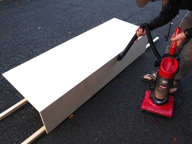 Antes de aplicar el barniz, utilizamos papel de lija (de grueso a fino) para preparar la madera. Lija siguiendo la veta de la madera. Una vez que la superficie era suave al tacto, nos aseguramos de que no había ningún polvo izquierda. Lo hicimos fuera de modo que el polvo no estaría en la misma habitación donde aplicamos el barniz. Utilizamos un aspirador para aprovechar al máximo el polvo y, a continuación, un trapo húmedo hasta el final.