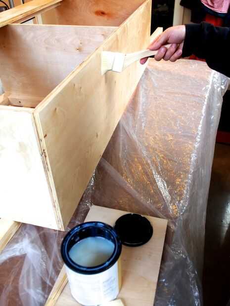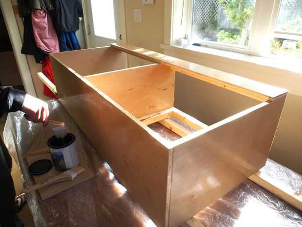 Para proteger la madera, hemos barnizado los bancos dentro y fuera con 2 manos. Utilizamos un acabado mate por razones de estilo, pero un acabado brillante funcionaría igual de bien. Utilizamos Broda (una empresa de Vancouver BC base) Pro-THANE Ultra-Clear gabinete y ajuste, con un acabado mate.