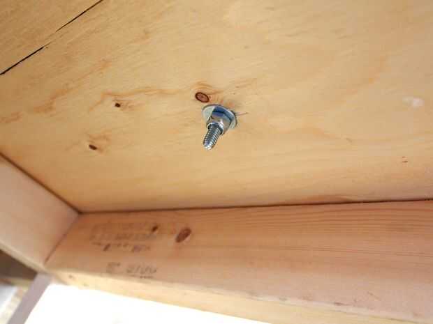 - Asegurándose de que el Banco no se mueve, perfore a través de los postes de la parte inferior, la alfombra y la plataforma de madera contrachapada. Puede ser difícil de encontrar puntos que no están alineados con postes de madera por debajo de la plataforma. Para ayudar con esto, hemos tenido una persona bajo la plataforma y uno en la parte superior. Ambos medimos las distancias.