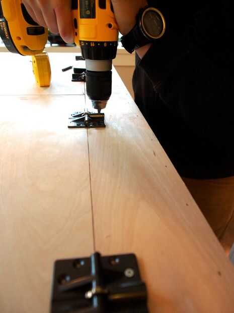 Con el taladro, rosca directamente dos tornillos (calibre 5, 5/8" largo) en lados opuestos. Una vez asegurado, terminamos los otros 6 para cada bisagra. Aquí, es realmente crucial que las bisagras estén perfectamente alineadas. Si no, no abran las puertas.