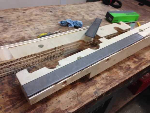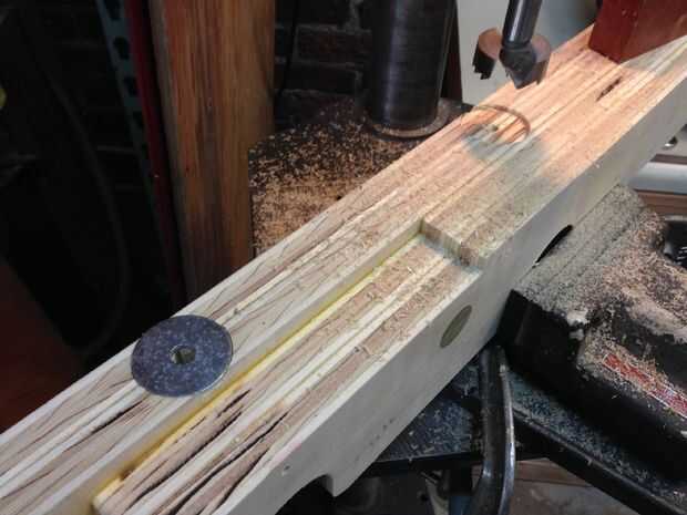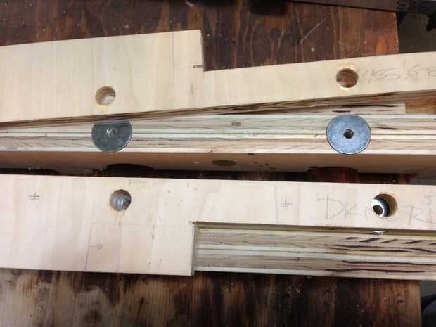 Asimismo, me preocupaba que los ganchos de j que sujetan los tirantes a los soportes del asiento teniendo mucho peso y apalancamiento. Para mantener estos de "tirar" a través de la madera contrachapada, solía una pieza Forstner de avellanar una 0,25" pila de 1.5" arandelas fender debajo de las tapas de apoyo. Otra vez, me pareció que un agujero de 3/4" a través de la parte superior justo suficiente para permitir una 0.5" cabeza hueca (que se adapta a las tuercas para el 5/16" j-hooks). Una vez que el tirantes y tops se clavado y pegados, nada del hardware del metal era fácilmente visible.