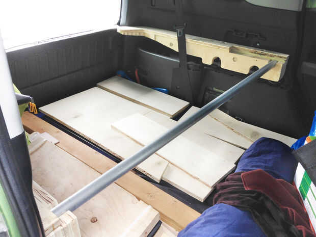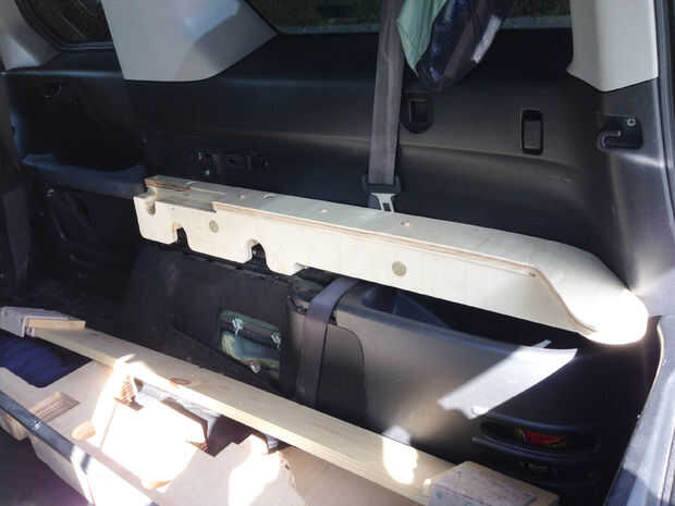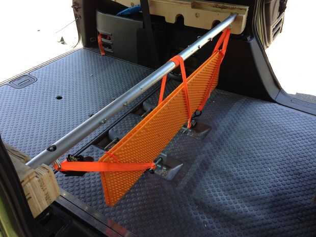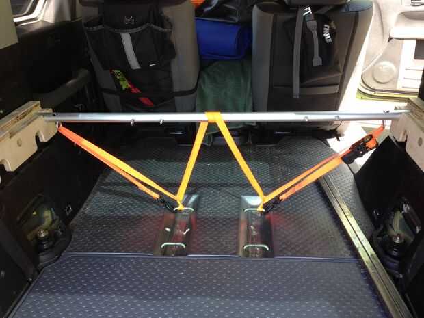 Como usted lo recuerda, mi principal preocupación es la seguridad. Aunque los refuerzos laterales son muy sólidamente atornillados a los soportes de asiento metal a lo largo de cada lado, también quería asegurar el ensamble todo lecho a los soportes de piso de metal. Ya que tenía una longitud de 1.5" robusto tubo de aluminio alrededor (creo fue rescatado de un escenario de concierto), la usé como un cross-brace, fijación a los soportes de piso con una correa de nylon de 1" (apretada por trinquete). Esto fue substituida más adelante con una mucho más fuerte correa y trinquete. Almohadillas de plástico tracción insertan entre las formas de correa un baluarte funcional entre las zonas de carga y pasajeros.