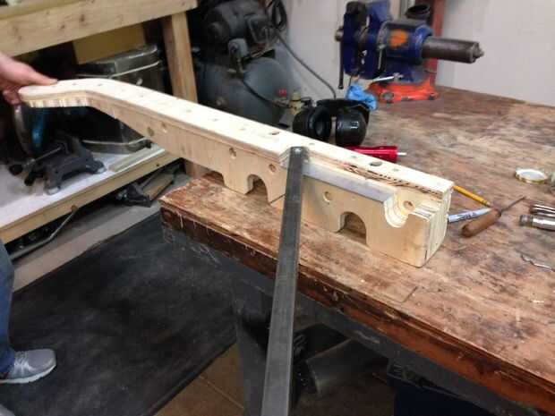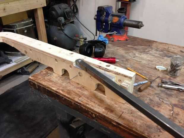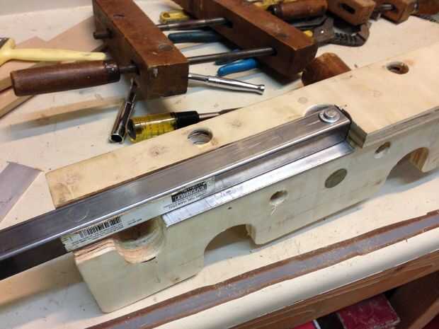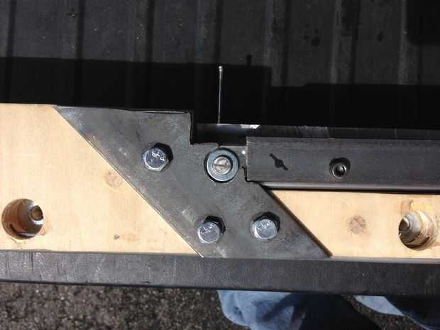 He utilizado 3/8" pasadores de horquilla (inserción de un pequeño tornillo en el orificio de la base, para asegurar el pasador en su lugar). Porque es posible que este pivote correría mucha fuerza (piénsese en "cuerpo humano en el extremo de un par de palancas"), he añadido un recorte adicional de refuerzo superior de acero 0,25". Si tuviera que rediseñar la cama hoy, avellanar la parte superior del perno de pivote en el soporte superior metálico o preferiblemente, reemplace la tapa de madera todo a cada montaje de abrazadera lateral con un pedazo de juego de 0,25" placa de aluminio (== prueba de bombas).