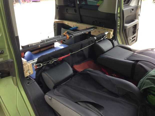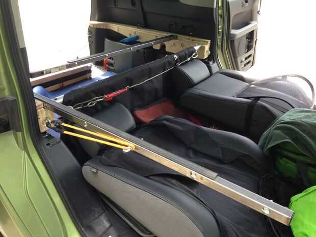 En segundo lugar, la cuna es permanentemente a lo largo del lado del pasajero y entonces temporalmente al lado del conductor cada vez que se implementa. Para evitar el brazo de cuna en el lado del copiloto tirando hacia el centro como se une el lado del conductor, he añadido un perno de ojo y una longitud corta del bungee (aquí, sólo un temporal para la instalación).