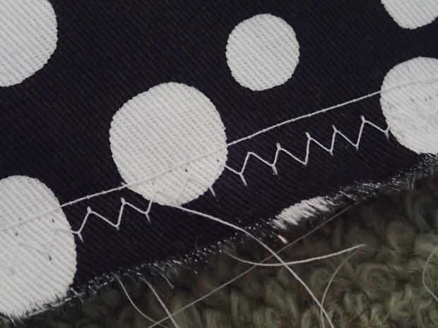 Coser alrededor de los 3 lados que se cubrió. Me ha optado por un zigzag 7 y 4 rectas, para que la tela fue asegurado con seguridad juntos pero todavía tenía un borde recto al lado derecho hacia fuera. Recordar para atrás al principio, final y todos sus rincones entre.