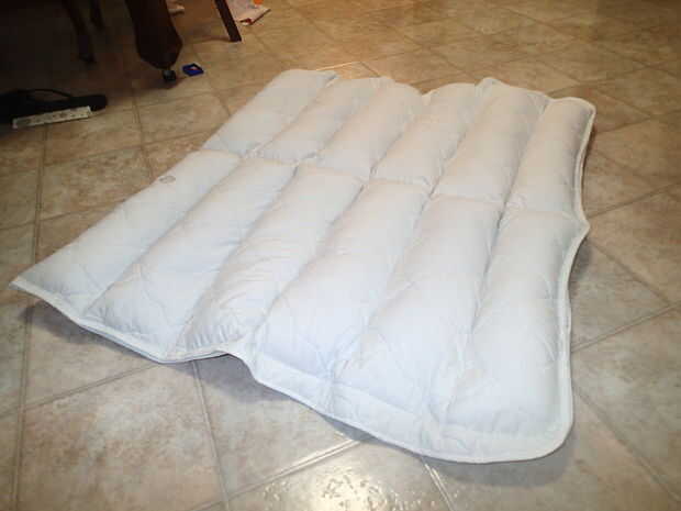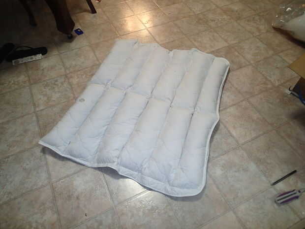 este proyecto utiliza vieja edredones, mantas, sábanas o fundas de almohada.  Puede teñir y rasgones pequeños pueden ser fijo.Tomar un consolador y cortar en trozos de 4 a 6 dependiendo del tamaño (completo, Reina, rey).Luego coloque una pieza dentro