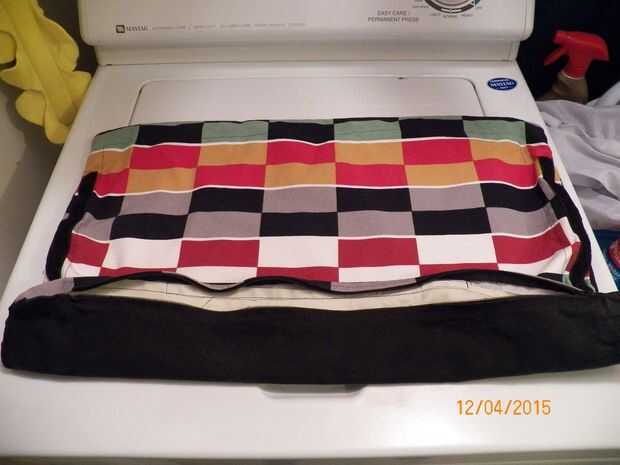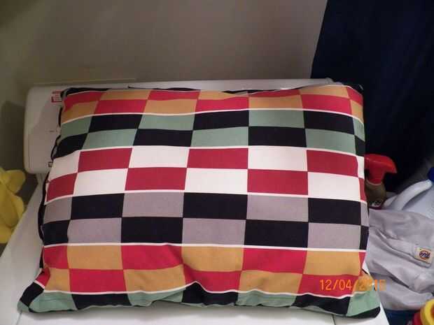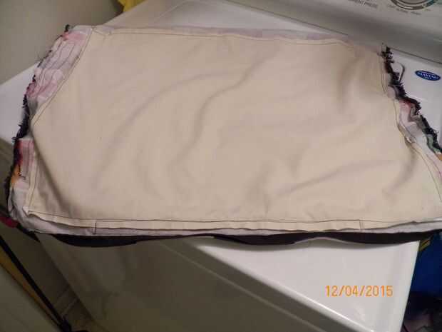 Medir el tamaño de la almohada. Mi almohada era 22 pulgadas por 16 pulgadas. Básicamente hice una almohada cubierta con la cremallera a lo largo de uno de los lados largos, este lado se convertirá en la parte posterior de la cama. Usé la tela del pato para la parte superior de la cubierta de la almohadilla y la tela para la parte inferior. No usé tela para la cubierta entera aunque hubiera sido el más duradero. La tela del pato es más suave y no quería a Lily para que pierda cualquier sueño de belleza. Os adjunto el agua a prueba de tela en la parte superior dentro de la funda de almohada en caso de un incidente insignificante. Ella pis en la cama en el pasado antes de rasgar aparte. Os adjunto también tiras del lado del lazo del Velcro a lo largo del perímetro de la parte superior fuera de la funda de almohada donde quería el collarín puesto. Usé 12 pulgadas de Velcro en cada lado corto de la cubierta y una tira de 18 pulgadas en el lado largo (mismo lado de la cremallera) de la cubierta.