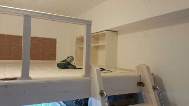 Debido a que los niños están creciendo y necesitan su propio espacio y nuestra casa ha limitado la zona de expansión, hemos decidido dividir la sala con el fin de crear espacio para un dormitorio extra, y estudio - jugando espacio para nuestros niños. Antes compartía su habitación con nuestra hija mayor y ahora ambos necesitan su propio espacio y privacidad. La sala ya se divide una puerta ha sido ordenada de un carpintero y tomé la reponibility construir sólida cama con un escritorio plegable y estantes adicionales.