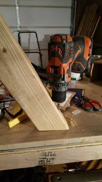 Ahora que ha creado una pequeña repisa para la broca en, el tablero de pie en su extremo y cuidadosamente perforar directamente a través de la Junta. Si tienes un taladro, ahora es un buen momento para usarlo. Mina era demasiado corto y la Junta no podía caber, por lo que la mina a mano usando una 1/4 broca. *** Tenemos un amigo sostenga el tablero mientras taladra - lo hará mucho más fácil mantener el taladro recto! ***
