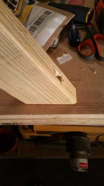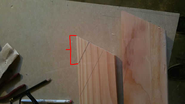Dado que nuestros aparatos se van a formar la hipotenusa de un triángulo rectángulo (geometría ooh!) tenemos nuestros ángulos añadir hasta 90 grados. Puesto que usted ya corta la placa, estos cortes en ángulo deben ser muy simples. Echale mi foto para ver lo que me refiero al tener la hoja apenas cruzando la esquina del tablero.