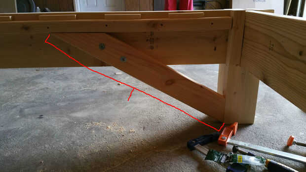 Gire las tablas para que su lado más corto (largo hacia arriba) y el ángulo de 30 grados delante de usted. Medir y colocar una línea en 2-5/8" a través de todos los refuerzos (sólo muestro dos en la foto).