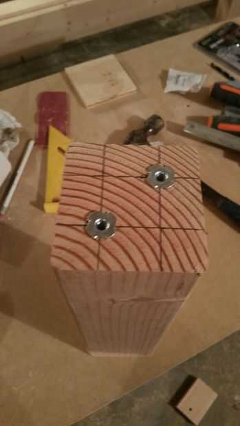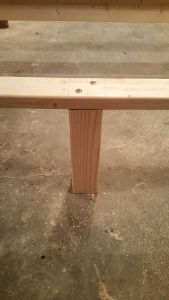 Colocar el poste debajo de la línea de 2 x 4, los agujeros con las tuercas en T y empezar a atornillar los tornillos en hasta que estén bien apretados.