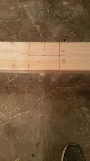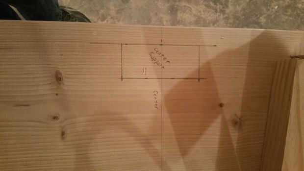 Marque el centro de su soporte central de 2 x 4 en la dirección longitudinal - debe ser 38-7/8 Si sigues mis dimensiones. Una vez que lo tienes marcado, coloque el poste en el centro de la ayuda y trazar sobre el tablero.