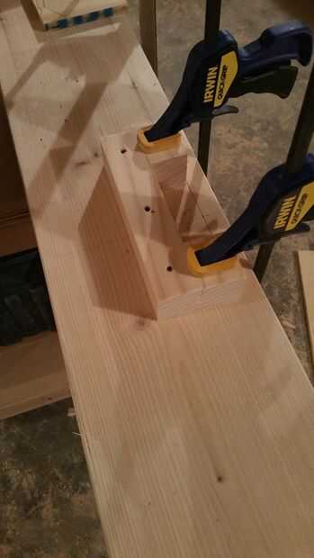 Después de que usted deje que el pegamento configurado, usted puede adjuntar los soportes a los carriles de la cabeza y del pie. A línea de la abertura con las marcas que ponga en las juntas, Aplique pegamento y sujete en su lugar. Mientras que las pinzas sujetar la pieza en su lugar, utilice una 1/8 broca haga algunos agujeros y atornillar el soporte en su lugar.