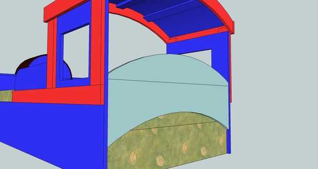 hice la cabecera de la izquierda sobre las piezas de corte de los arcos del techo (las piezas luz azul en el diagrama). Me uní a ellos mediante pasador pasadores y pegamento, y ahora tenemos un cabecero con curvas bien.