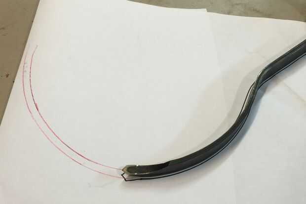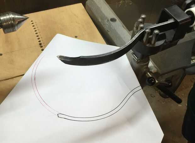 Coloque la hoja de papel sobre la cama de su torno y mantener la cuchilla en su lugar. Mirar la pantalla debe ser capaces de alinear el contorno sobre el papel con el perfil real de la herramienta. Yo corte una sección de un protector de hoja y había pegado al monitor. Luego usar un marcador, o como lo quieras usar, dibujar el contorno de la herramienta en la tapa del monitor. Utilicé las líneas punteadas para indicar la trayectoria prevista de la herramienta.