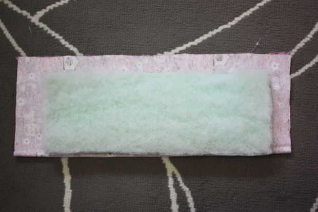 3. Coloque su espuma sobre la tela. El bateo no es necesario tener en este momento. Puesto que era mi espuma 1/2 pulgadas de espesor y esencialmente se cose una "funda" para que la espuma, me aseguré de que tenía un borde de 1/4" alrededor de mi espuma. Esto asegurará que mi tejido se ajusta perfectamente alrededor de mi espuma.