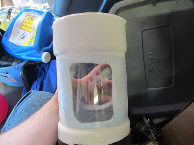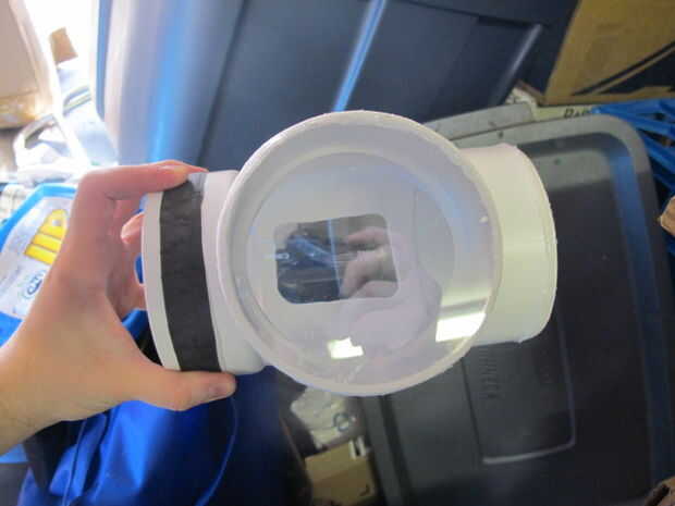 Con el cuidado de la "óptica" tomado, luego cortar una tira de la muñeca del guante de caucho izquierdo y pegado lateral de goma para arriba alrededor de la abertura del lado derecho de la "T". Se trata básicamente de una junta. También se aplica una capa de la silicona ubicua a sellar.