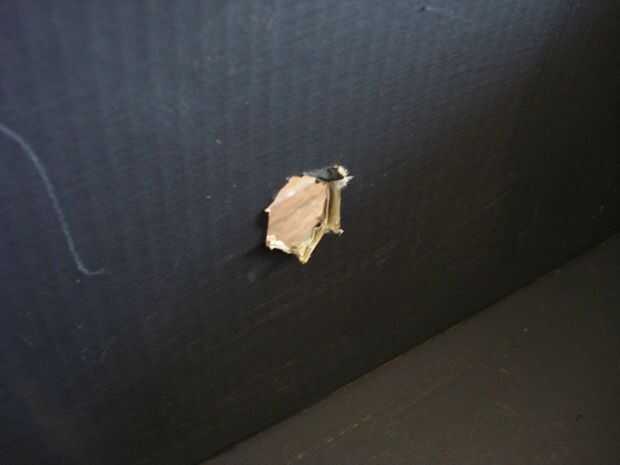 Corte un hueco del tamaño de dedo en medio de uno de los lados largos de la caja. Luego la cinta la pieza de metal en el exterior de la caja, centrado con el agujero. El pedazo de la cinta debe ser más grande que el metal y cubrirlo completamente.