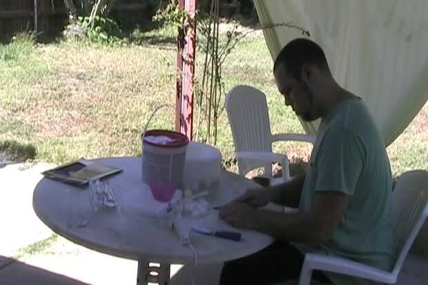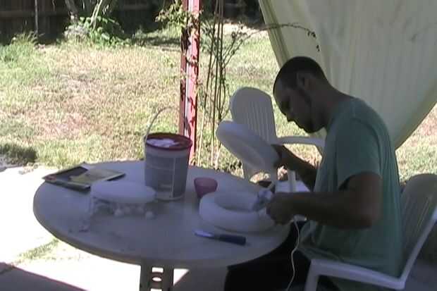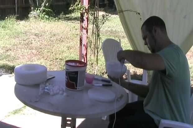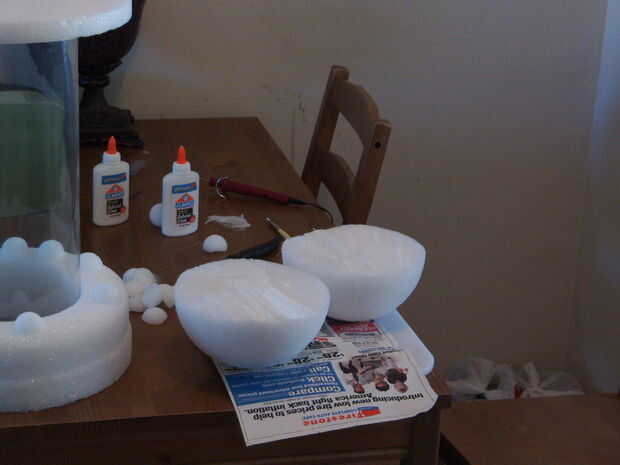 Luego unir los dos cilindros, con una pistola de pegamento caliente de baja temperatura (importante: una pistola de pegamento caliente de alta temperatura funde la espuma de poliestireno). También se puede utilizar pegamento escolar o cola para madera. Asegúrese de probar el pegamento primero para asegurarse de que no derretir el poliestireno.