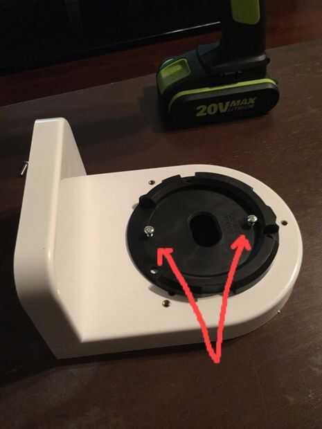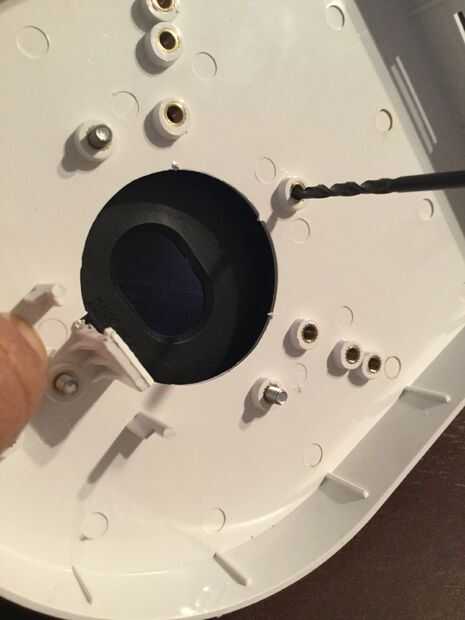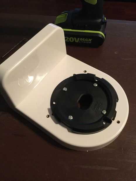 Tornillo de 3 de los tornillos como se muestra (imagen muestra 4 tornillos pero solo necesitas 3) en la imagen y el lugar el negro redondo plástico boca abajo. Tirón dos pedazos juntos y perfore el orificio que le falta el tornillo con la broca de 3/16 Retire el tornillo en el lado opuesto y utilice ese tornillo para sujetar el plástico redondo negro para el soporte de la misma manera (boca abajo) y ahora taladre el agujero donde Quite el tornillo; Este tornillos le ayudará a mantener el plástico negro centrado en el soporte, repetir el mismo proceso en los otros dos tornillos por lo que terminan con cuatro tornillos alineados a los derecha orificios en el soporte al igual que la última foto.