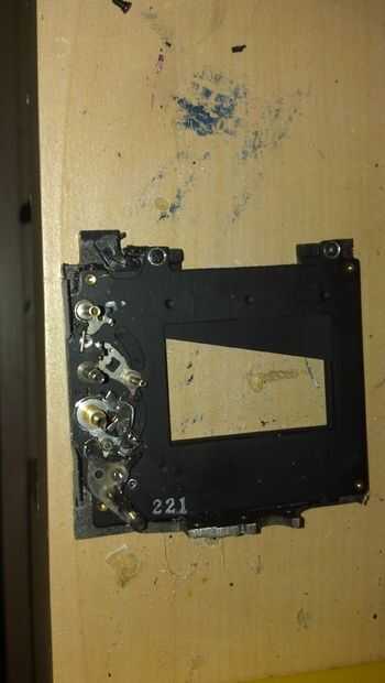 Cuando el obturador está hacia fuera, usted debe tener solamente las pantallas sobre el obturador y unos pines en el lado de la carcasa que controlan la actuación de las pantallas. Yo he representado el obturador una vez que salió de la cámara. Tuya debe ser similar. Juega con las piezas mecánicas del lado de la persiana y averiguar qué pieza tiene que mover conseguir el obturador para abrir y cerrar. Debe haber una pequeña clavija que mallas con el sistema mecánico de la cámara cuando el obturador todavía fue unido. Anote la ubicación de este pin.