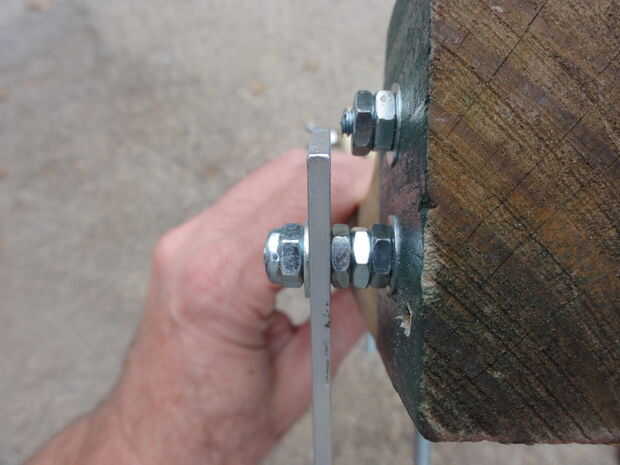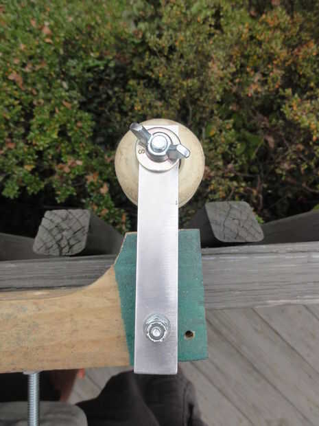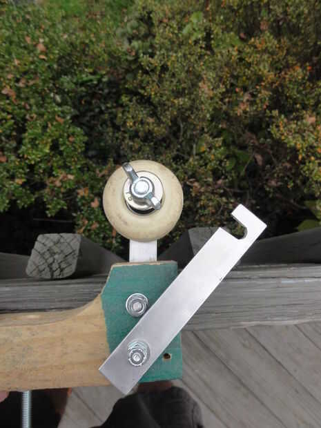 Por un lado corte una ranura en el lado del soporte que le permita hacer pivotar encendido y apagado el perno del eje para permitir que el aparejo montado en o extraído el cable mientras se encadenan entre sus apoyos. Corté la parte superior de los dos tornillos de máquina cortos después de asegurar con la tuerca y las arandelas para permitir el soporte rotar en solamente el perno de la parte inferior.