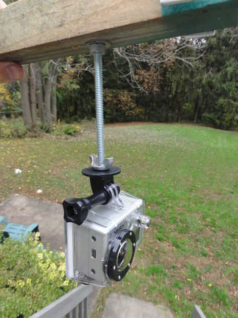 El primer agujero era sostener el 1/4"- rosca 20 x 5" perno para el montaje de la cámara. Esto fue asegurado con una tuerca arandela y 1/4". Una tuerca de mariposa de 1/4" asegura la GoPro trípode al perno en la posición deseada.