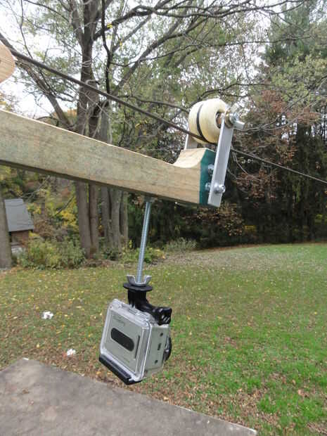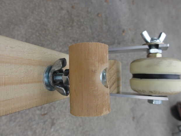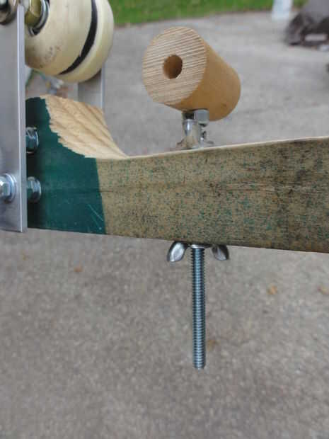 El segundo agujero fue para un perno adicional 1/4 "x 5" que fue insertado en un agujero perforado a través de una pequeña sección del pasador madera de 1" de diámetro. La cabeza del perno fue empotrada en la espiga y las aristas suavizadas con lija. Este perno fue asegurada a la espiga con una tuerca de 1/4" y luego una tuerca de mariposa de 1/4" fue agregada antes de insertar el perno a través del cuerpo. Una segunda tuerca de mariposa de 1/4" fue agregada debajo del cuerpo. Estos dos tuerca de mariposa permite este montaje de freno levantado y bajado fácilmente. Si el cable es fijado en una empinada pendiente, el freno puede aplicarse para hacer más lento el descenso.