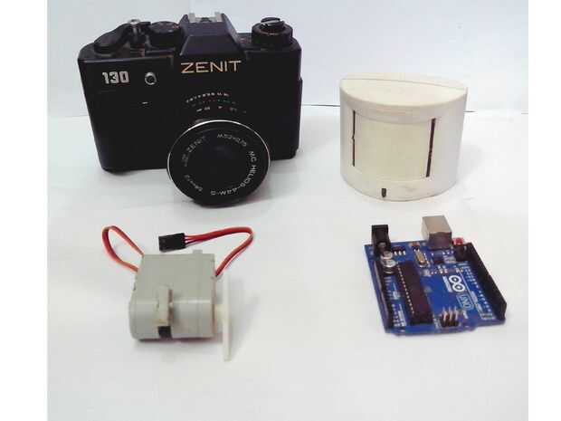 Gopro activado por movimiento, el sensor de ultrasonidos mover el servo cuando algo aparece cerca del sensor, puede ser programado para tomar fotografías o video, y también puede programarse que deje de tomar fotos cuando no hay ningún movimiento en