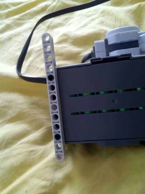 Coloque una viga (13) en la parte inferior de la NXT, esto debería mantener estable. Ahora Conecte los cables. Sensor ultrasónico-4 Motor-A Eso es el edificio hecho! Ahora permite avanzar la programación de la...