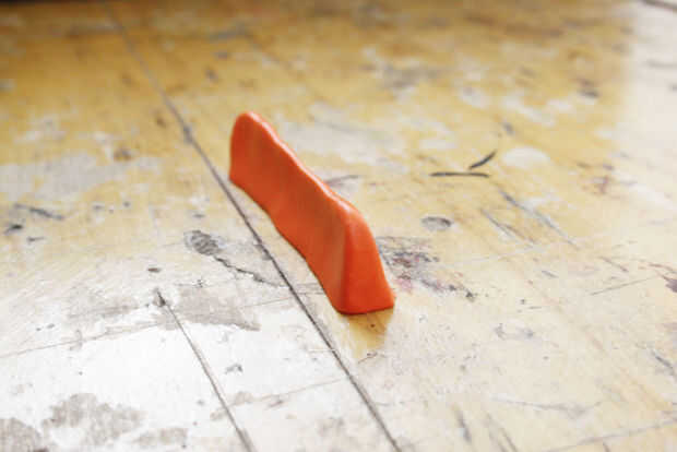 a continuación, utilice sus extremidades del dedo índice y pulgar para construir la pared de la base. Construir la pared de la parte inferior pero mantener una firme base para que tu muro de forma de una cuña vertical con la base amplia en la parte inferior. Esto ayuda a mantener el Sugru atada firmemente a la superficie.