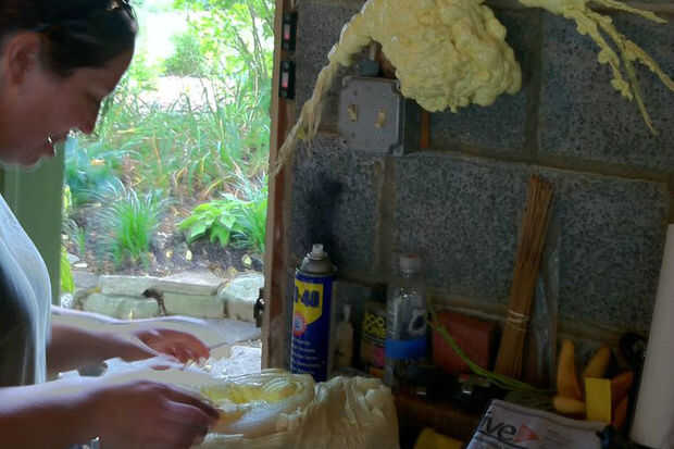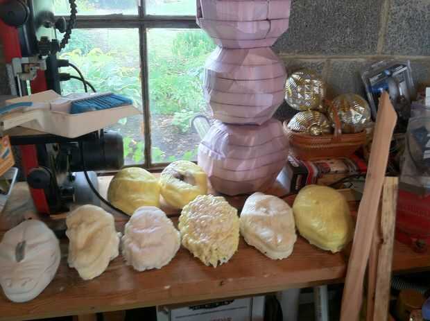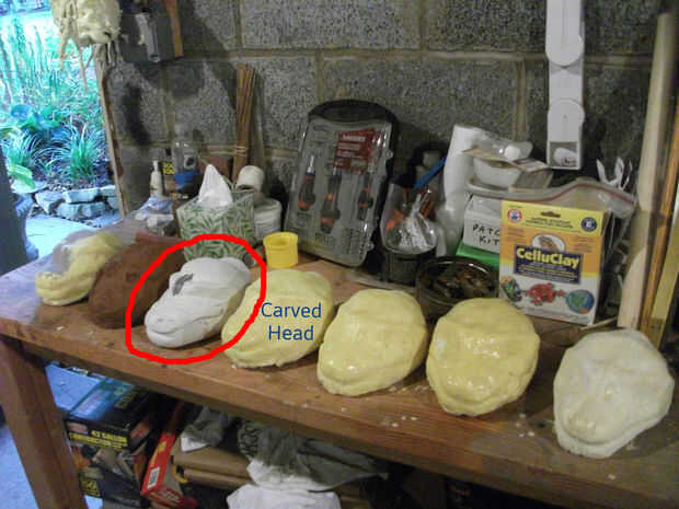 Las varias cabezas en la foto son diferentes tipos de expansión de espuma. He probado todos los tipos para ver que se hace el mejor elenco. Como veis en la foto algunos de los tipos de espuma no llevó a cabo su forma bien. Me terminó gustando la espuma Window & Door (el azul puede de cosas grandes) el mejor y terminó el resto de los jefes en eso. Las cabezas más amarillas (los dos en la espalda) y en el lado opuesto de la cabeza tallada original son la espuma, ventana y puerta.