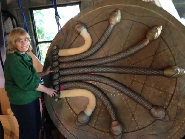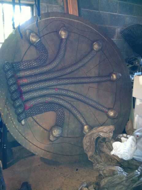 Las cabezas fueron pintadas con el mismo bronce como las escalas y a los órganos con pegamento de espuma. Resistente que velcro se usa para fijar las serpientes a la puerta. Utilizamos el velcro para que las serpientes podrían ser quitadas para facilitar el almacenaje.