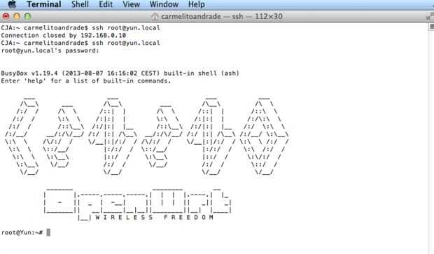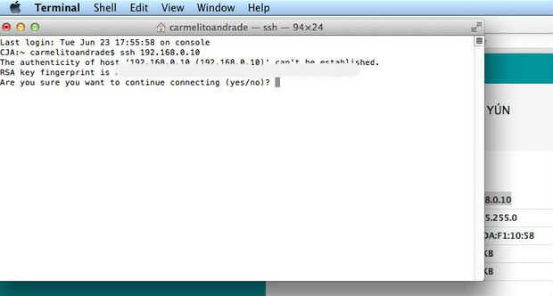 Nota: Si no eres capaz de resolver la IP de yun.local, averiguar la dirección IP de su Yun y utilizar la dirección IP en lugar de otro (como ssh root