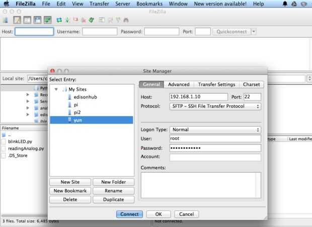Para acceder a los archivos y cargar código python en la tarjeta SD de su Arduino Yun, puede utilizar a un cliente FTP como FileZilla , WinSCP.