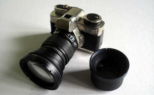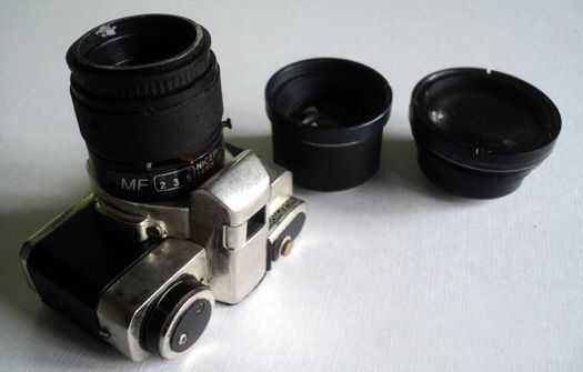 Parasol se hace por tuberías de PVC y tiene un lente compuesto, con enfoque a sistema y dos lentes de extensión para Macro y gran angular también. Apertura, consiste en cuatro láminas, 3 paradas de f, f los puntos son 10, 6, 4 (no exacta), hoja de rayos x una hoja.
