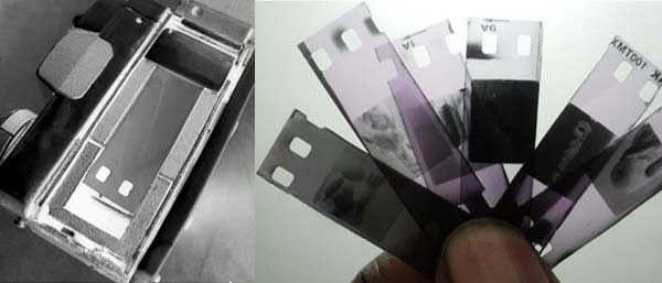 Obviamente tengo que recortar el rollo de película según el tamaño del titular de la película de mi pequeña cámara. Su altura es de unos 10mm, pero es bastante difícil aunque mantuve provisión para el cartucho de película. Tuve que abandonar la idea porque tira de la película debe ser igual en altura al moverse libremente de cartucho de la película al cargador y al corte hay posibilidades de conseguir arañazos. También tengo bastantes películas, así que finalmente ha ido para películas de tira, es más fácil de recortar y ninguna posibilidad de perder el de las películas, lo único que es después de cada tiro que tengo que ir el cuarto oscuro y necesita sustituir a una nueva. Si uso película real vástago cartucho sobre que puedo tomar 20-25 broches de presión.