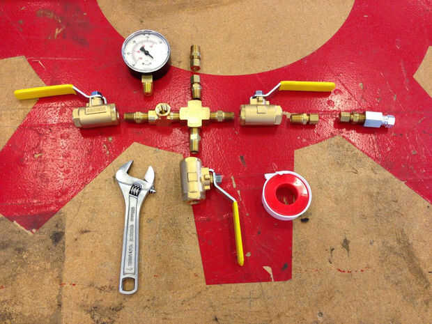 Vamos a entrar la parte más fácil del camino primero. Para este paso, usted tendrá su bolsa de accesorios, las válvulas, el calibrador de presión, un rollo de cinta de teflón y una llave.