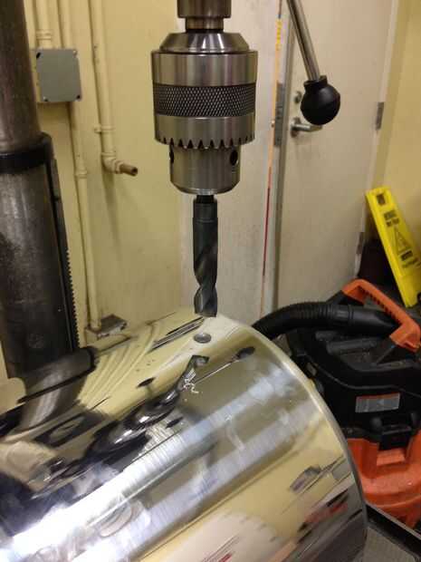 En este punto debe tener todo alineado, reprimieron y trabada en su lugar. Cargar la broca más pequeña y el taladro a una velocidad que es apropiada para cualquier tamaño de poco vas a empezar con. Ahora, taladre el primer agujero. Si usas una olla enorme, probablemente vibre y charla mucho. Sólo tienes que ir lento y detrás de si las cosas se ponen demasiado locas.