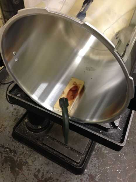 Con esto en mente, baje la mesa hasta que la olla quede debajo de la primera broca y luego encontrar madera y abrazaderas para sujetar todo a la mesa. Obtener todo alineado para que el orificio final será una o dos pulgadas por encima del fondo de la olla a presión. Si el tuyo tiene un fondo redondeado, como el mío, luego mover el agujero de una pulgada o dos por encima de la parte superior de la parte redondeada. Una vez todo alineados, apriete las abrazaderas y la tabla en lugar de la cerradura.