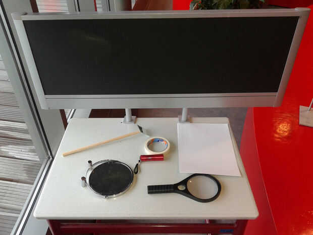 Una pantalla con un ángulo de 90 grados con la tapa de tabla en la que poner el espejo cóncavo
